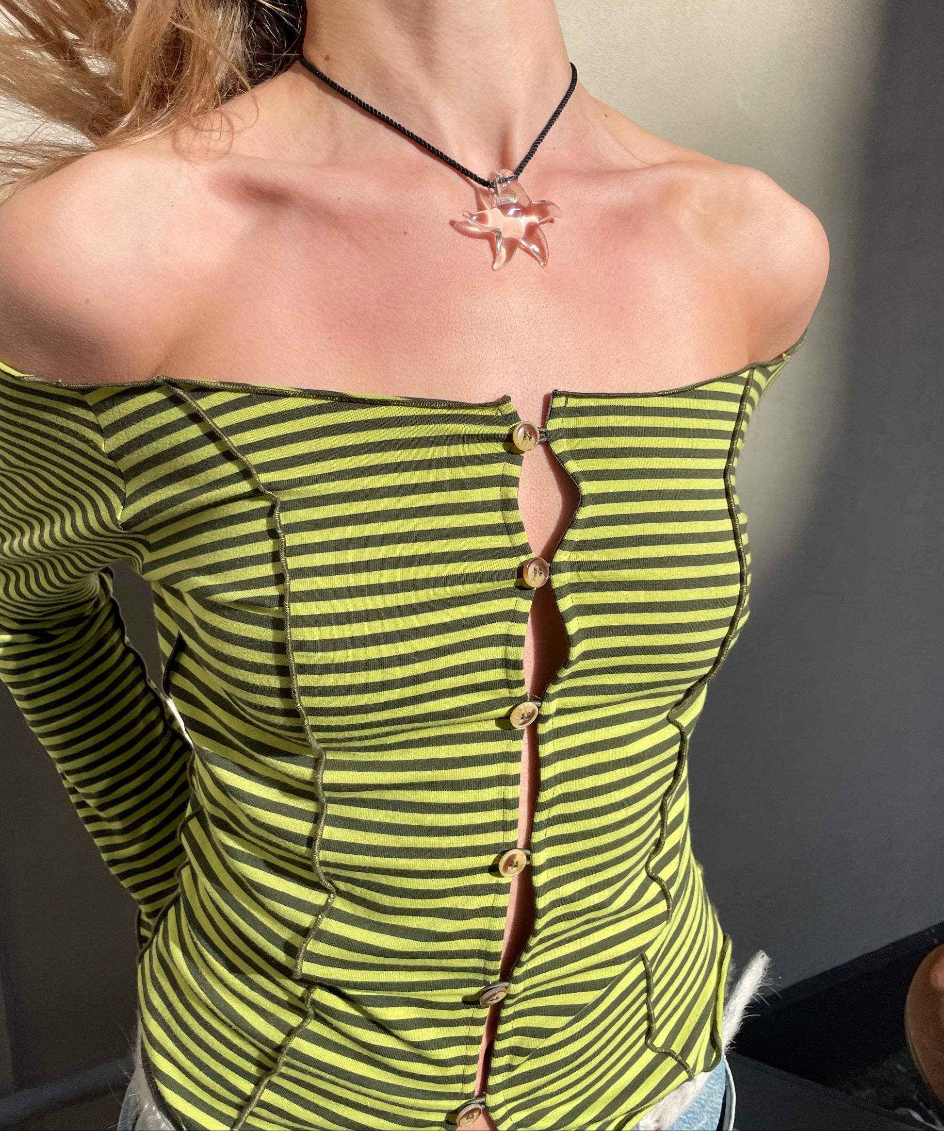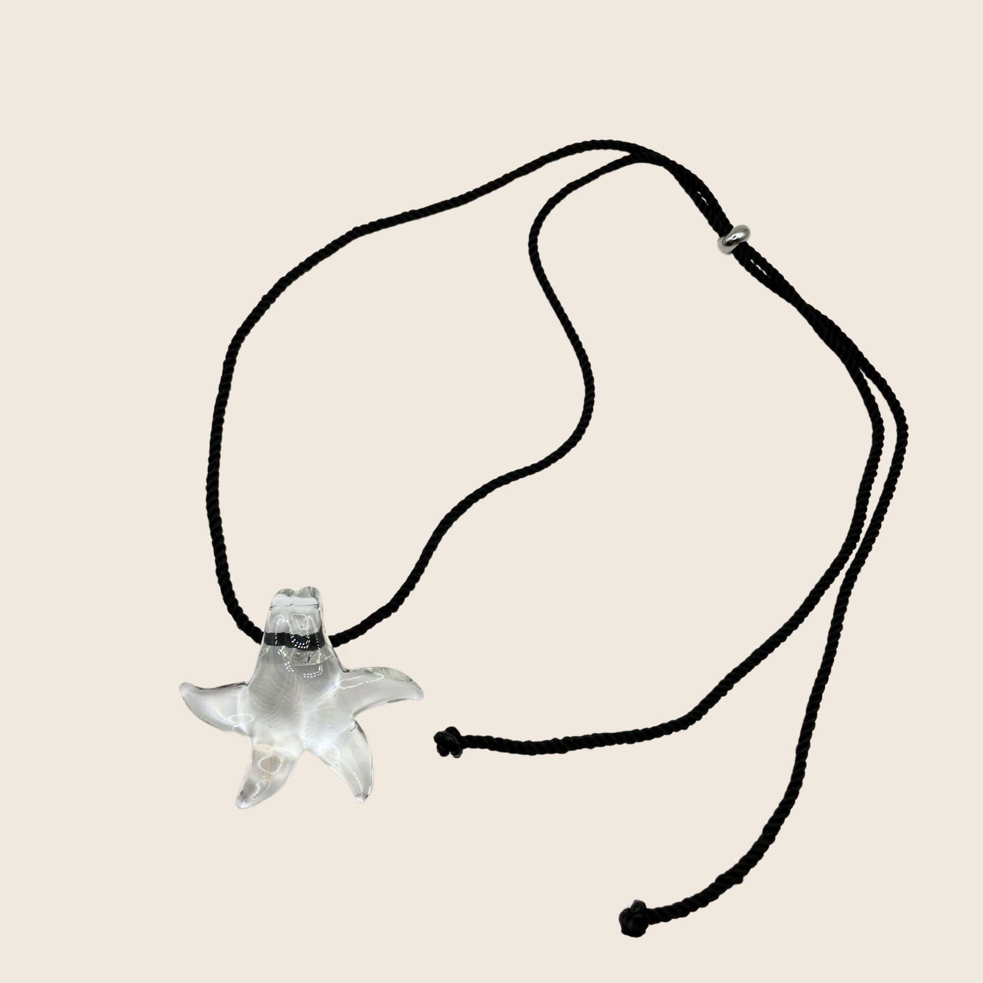 A stunning piece of jewelry that is sure to add a touch of magic and sparkle to your outfit! The pendant is made of clear glass in a star shape, resembling a piece of candy, and is carefully handcrafted to create a unique and one-of-a-kind appearance.