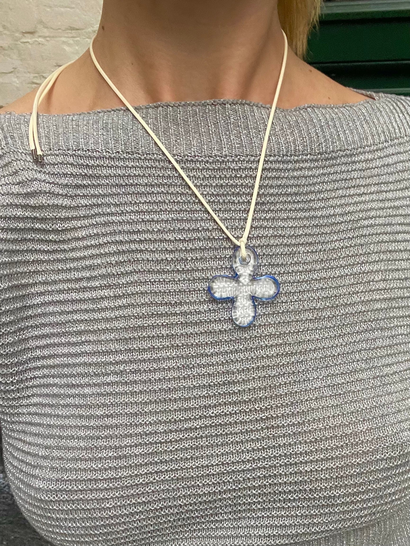 The Halo Necklace features a hand-shaped light blue glass cross that seems to glow from within, catching the light with every move. Each pendant is handmade, giving it a soft, organic texture and slightly fluid shape that makes every piece one of a kind. Strung on your choice of a dark brown or creamy white adjustable cord, it can be worn loose and relaxed or as a closer choker style. Designed in Copenhagen, this necklace brings a dreamy, ethereal touch to any look - simple, luminous, and effortlessly cool.