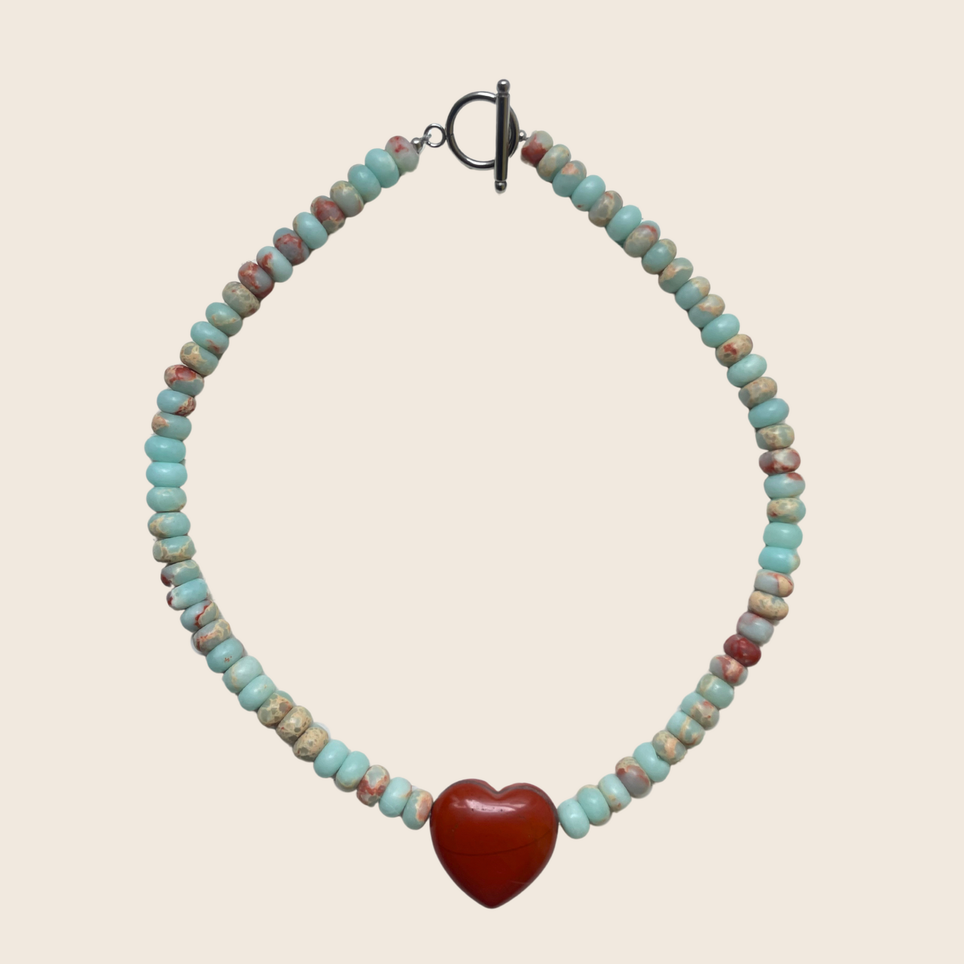Our handmade gemstone necklace combines the grounding power of Imperial Jasper with the vibrant energy of a Mookaite heart pendant. Designed to stand out, the necklace features smooth turquoise-toned Imperial Jasper beads with unique natural marbling, paired with a bold deep-red Mookaite gemstone in the shape of a heart.