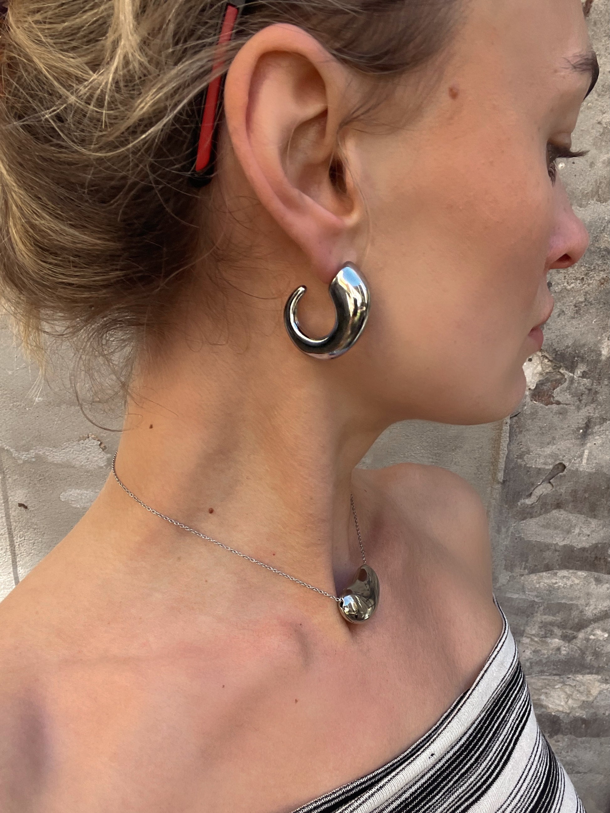 The Details: • Sculptural horn-shaped hoops in sleek silver tone • Smart hollow design - all the drama, none of the weight • Stainless steel construction that keeps its shine • Post back fastening for secure wear • Made for the minimalist who likes to make waves