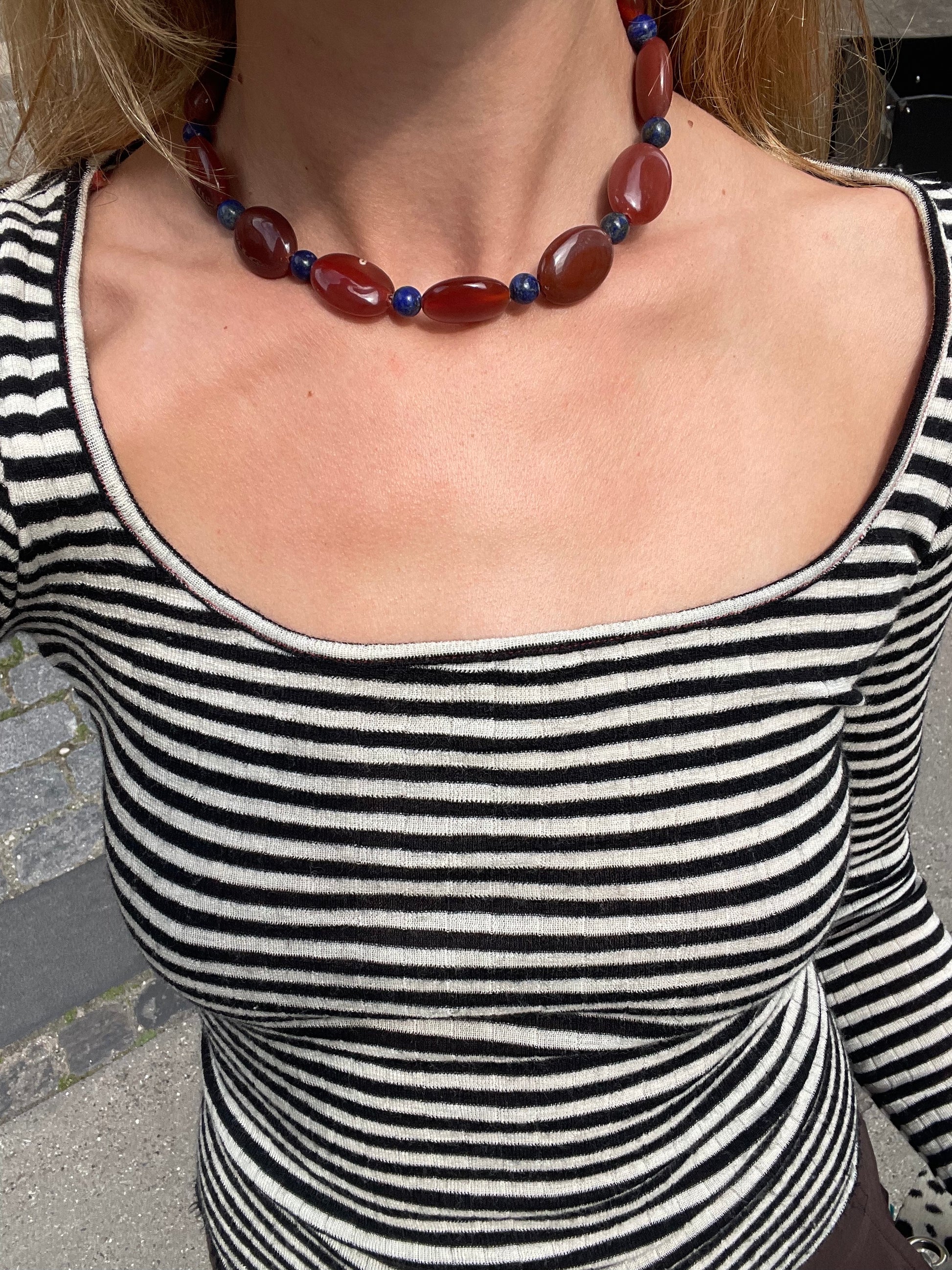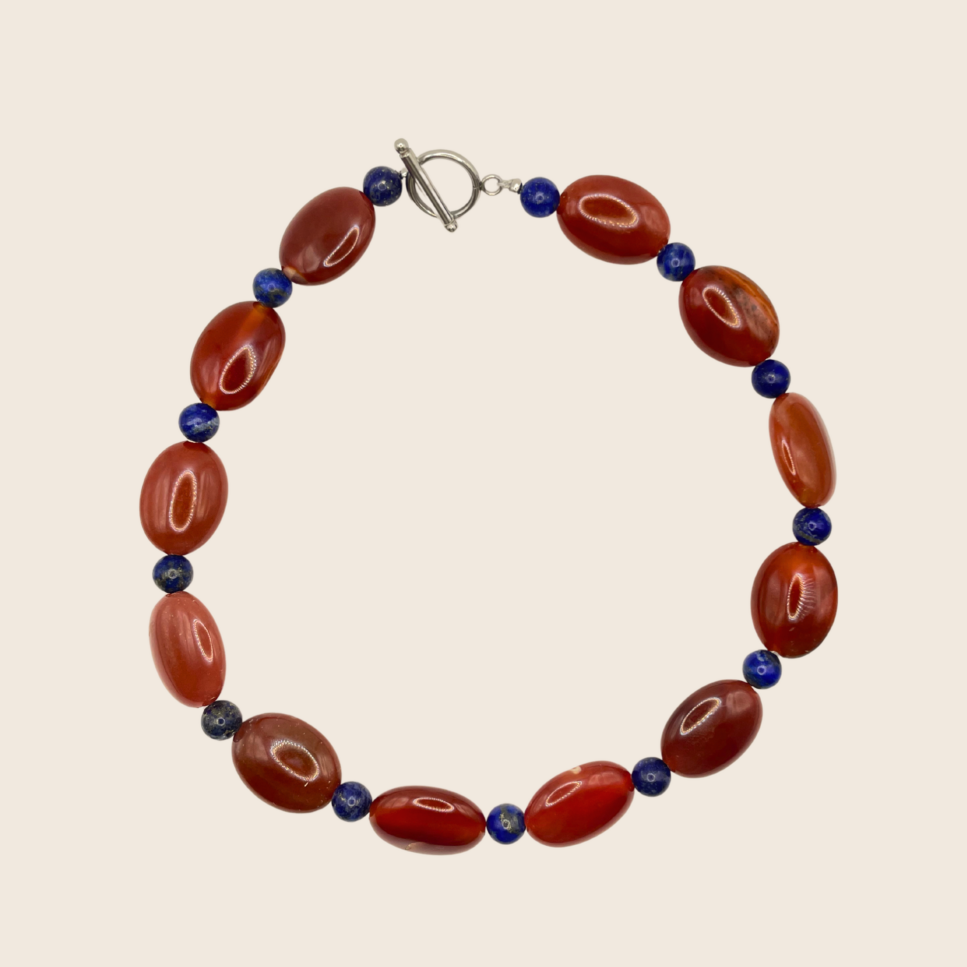 It sits as a modern choker that catches the eye whether worn alone or layered with delicate chains. Carnelian is known as a stone of vitality, creativity, and passion, while Lapis Lazuli represents wisdom, truth, and self-expression. Together they form a necklace that feels empowering, radiant, and unapologetically confident.