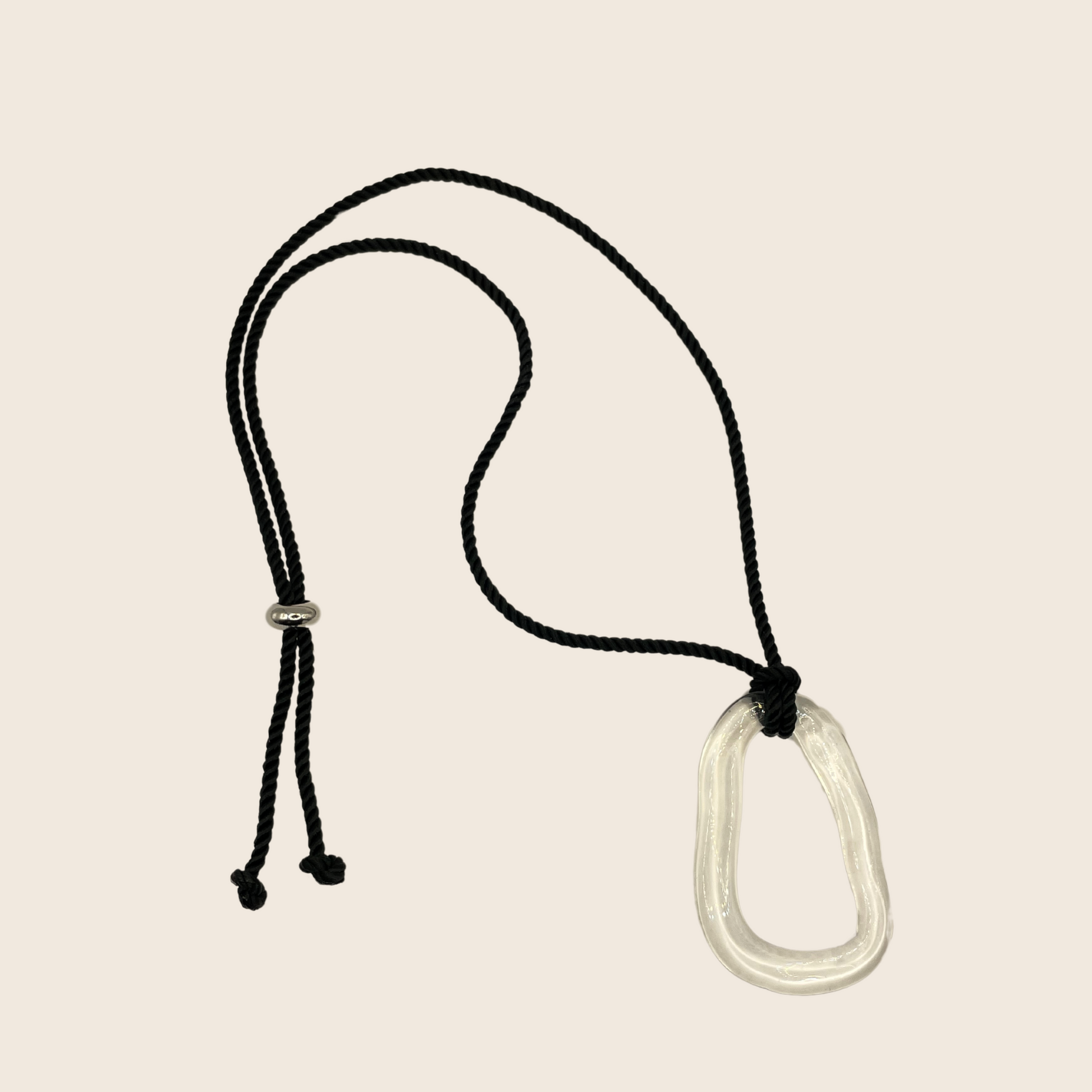 The necklace features a delicate oval glass pendant that is carefully handcrafted to give it a unique and elegant appearance. The pendant is suspended on a leather string that adds a touch of sophistication to the design. The length of the necklace can be easily adjusted to suit your neckline.